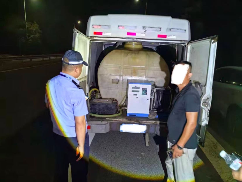为精准打击违法行为,执法人员先通过市民提供的线索划定重点区域,再结合路段监控追踪可疑车辆轨迹,最终锁定一辆频繁在天目路周边活动的改装面包车。行动当天,执法人员在附近设伏,当面包车停靠路边,正为货车连接油管加油时,立即上前控制现场。