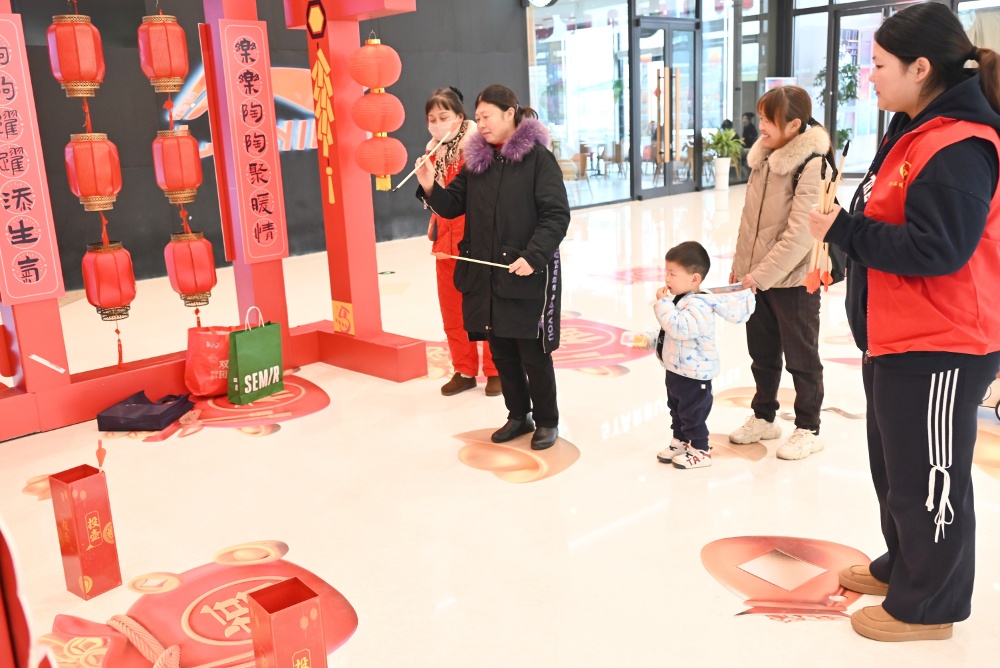 作为海陵区文明实践向商圈延伸的创新载体,中骏商圈·新时代文明实践街区化身“传统文化体验场”,设置“墨韵挥春”“非遗拾趣”两大主题区,吸引众多居民驻足体验。