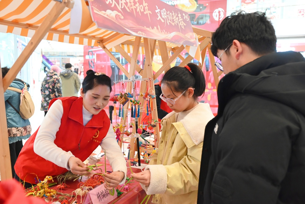 而在“非遗拾趣”区,则是一片其乐融融的动手场景:在非遗传承人的指导下,大人孩子共同拓印吉祥福卡、剪出精巧窗花;糖画师傅以勺为笔,顷刻间勾勒出生肖甜蜜造型;迷你竹编小马在指尖渐渐成形,投壶游戏传来阵阵喝彩……每一件亲手完成的作品,都是一段可触摸的新春记忆,让古老技艺在亲身参与中重获生机。