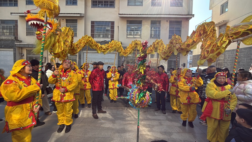 突然响起的锣鼓声把周围居民都吸引了过来。《唱凤凰》的悠扬曲调带着浓浓的乡土韵味,爷爷奶奶们跟着轻轻哼唱;紧接着,五彩祥龙腾空而起,在舞龙队员的手中翻滚腾跃,时而盘旋,时而昂首。孩子们追着龙珠跑,笑声与喝彩声把现场变成了欢乐的海洋。