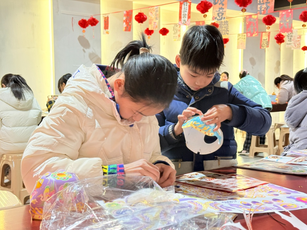 这里可是人气爆棚!爸爸妈妈和宝贝们围坐一起,全神贯注地制作醒狮灯笼。小朋友踮着脚给灯笼装眼睛,家长在旁边帮忙固定骨架,配合得默契十足。剪纸区则静中有动,红纸翻飞间,一幅幅“春”“福”“祥马”窗花悄然绽放——贴在家里的窗户上,就是最有温度的装饰。