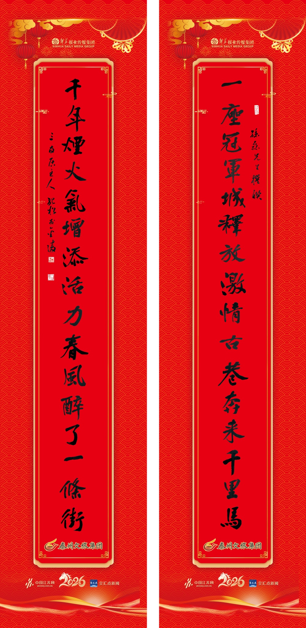 既嵌马年祥瑞之意,又藏泰州“冠军城”的奋进姿态,绘就老街千年市井的温情画卷。江苏省书法家协会秘书长纪松,也是从泰州走出来的。他以秀逸灵动的笔意挥毫题联,笔墨洒脱、气韵贯通,让文字之美与书法之韵完美融合。