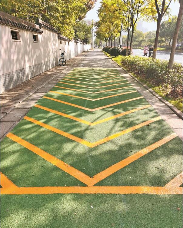 据民警朱明皓介绍,“非机动车道主动减速系统”设在震泽路由东往西方向雪浪苑管理中心路段(如图),因为这个路口右转机动车较多,而直行的非机动车由于车速过快经常来不及刹车,与机动车发生碰撞。安装减速系统可以提醒电动自行车驾驶人主动降速。在此路口,交警在左侧机非隔离绿化带内竖起了一块黄色三角形标志牌,同时还有一块写着“前面路面凸起请减速慢行”的警示牌,用于提醒过往非机动车主动减速。同时,在路面设置了长约15米的提前强制减速系统,减速带区域以醒目的绿色为底色,上面漆划黄色地标线。在减速带后端则设置了一条横向减速丘,通过路面凸起达到强制减速的效果。