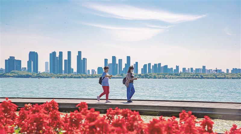 昨天上午,无锡市民在蠡湖国家湿地公园内散步。近年来,无锡蠡湖景区大力开展蠡湖国家湿地公园湿地修复、水生态治理和植被恢复建设、湿地科普及环保宣传志愿服务活动,生态环境越来越好,来湿地“安家”的动植物种类也日益丰富,生物多样性得到明显提升。(宗晓东 摄)