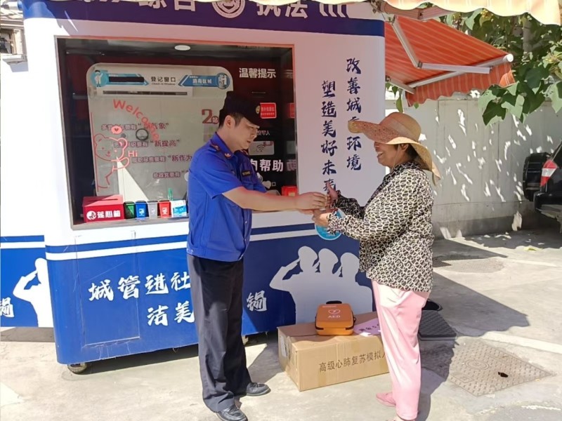 据了解,目前站内不仅配备了血压计、血氧仪、充气泵、急救箱等便民工具箱,还配备了自动体外除颤器(AED)。驻点城管队员许大炜主动“充电”,接受红十字会专业培训,掌握AED操作技能,并取得初级红十字救援员证,让“城管小站”具备了应急救护功能。