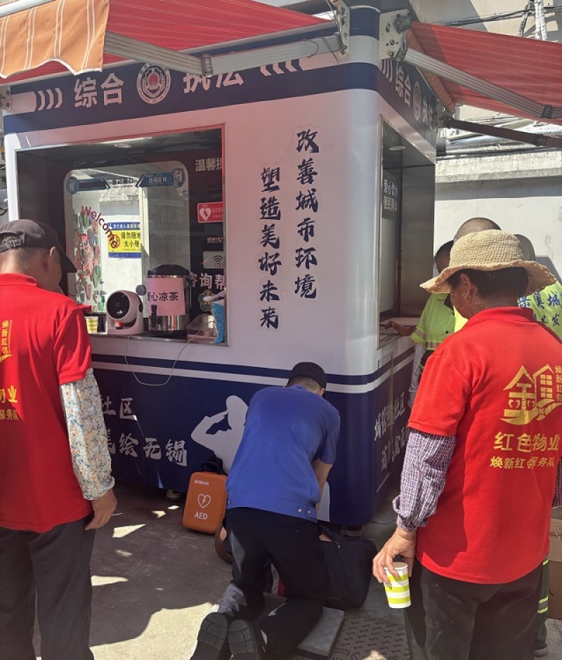7月7日上午,“城管小站”正在开展一场充满温情的“公益急救培训送清凉”活动。城管队员精心准备了凉茶、补液盐及清凉油,为附近高温下劳作的环卫工人、物业人员及过路市民送上一份份清凉与关怀。活动现场,城管队员许大炜给环卫工人、外卖小哥、物业人员及周边居民演示心肺复苏、海姆立克急救法、人员中暑以及AED使用方法等,并与大家实操演练。