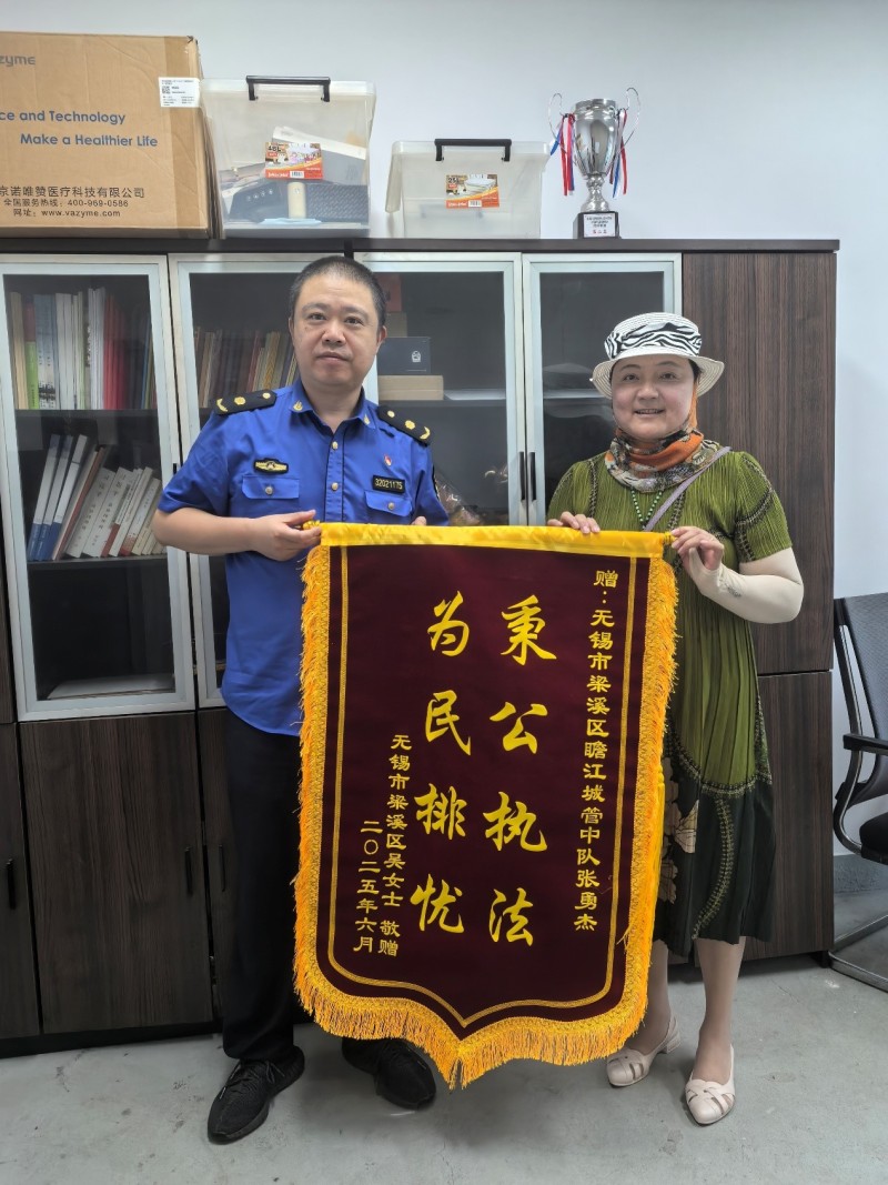 “真是太感谢张勇杰同志了,这么热的天,跑前跑后帮我们解决问题,把老百姓的事放在心上!”近日,市民吴女士特意来到无锡梁溪城管瞻江中队送上锦旗,再三感谢中队队员张勇杰为其解决因路面施工隐患导致的摔伤纠纷,言语间满是感激。
