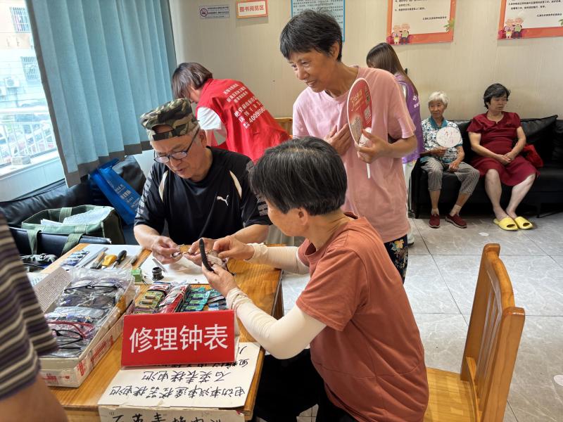 市集现场涵盖义诊、鞋类干洗、手机贴膜、钟表维修等多项便民服务,全方位满足居民的不同需求。义诊专区内,医护人员耐心为老人提供免费血压测量、血糖检测服务,一边记录数据,一边细致叮嘱:“张阿姨,您血压稍高,平时得少盐少糖多散步。”“李大爷,血糖控制得不错,继续保持规律饮食。”专业又暖心的叮嘱让老人们心里踏实。维修服务摊位前,工作人员娴熟地为老人贴好防刮膜、调试走时不准的钟表,看着焕然一新的手机屏幕和重新正常运转的旧物件,老人们脸上洋溢着满意的笑容,不住地称赞:“在家门口就能享受到这样的服务,真是太方便了。”这些看似微不足道的修修补补,却切实解决了老人们生活中的实际困难,为他们的日常生活带来了极大的便利。