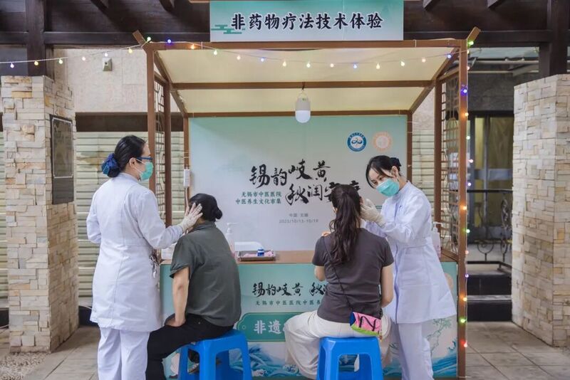 非遗与中医特色技术区集中展示了龙砂医学诊疗方法、黄氏喉科疗法、刘氏骨伤疗法、丁氏痔科疗法、针灸(杜氏金针)五大省级非遗项目,还有耳穴压豆、刮痧等中医适宜技术供市民体验。