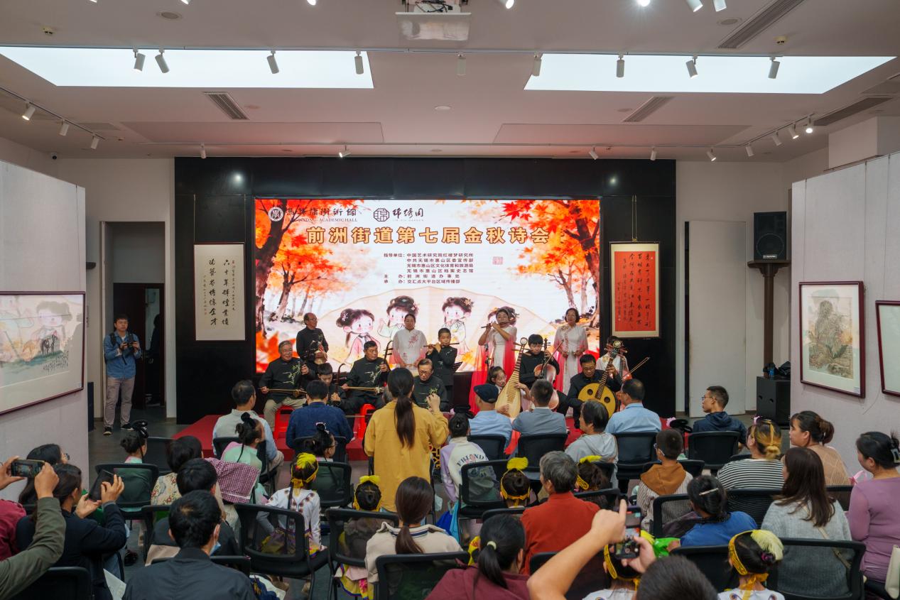 红楼游园会后,前洲街道第七届金秋诗会在冯其庸学术馆优雅启幕。诗会以邓巷社区民乐团带来的合奏《金蛇狂舞》激昂开场,随后中国艺术研究院研究生院师生及前洲街道表演团体带来的演出精彩纷呈。舞蹈《小荷尖尖》《维爵》展现江南灵秀,独唱《红豆词》再现红楼经典,吉他弹唱《马马嘟嘟骑》《青花》则带来了传统与现代的碰撞。特别值得一提的是,即兴诗朗诵环节,不仅展现了表演者深厚的文学功底,更体现了出色的现场应变能力,将整场活动的氛围推向高潮。