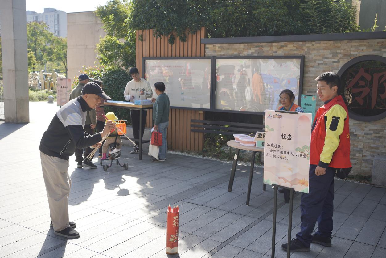 便民服务暖人心,趣味运动更添活力。广场另一侧,老年人趣味运动会人潮涌动。考虑到老年人的身体特点,社区精心设计了投沙包、投壶、夹乒乓球、转呼啦圈等7个低强度、高趣味的项目,既有竞技性,又不失娱乐性。比赛现场,老人们热情高涨,纷纷踊跃报名参与,以“通关打卡”形式领取心仪小奖品,整个广场充满了欢声笑语。家住远洋小区的吴阿姨拿着获得的小礼品,难掩喜悦之情,她表示:“平时在家总觉得闷,今天和老邻居们一起玩游戏、拿奖品,感觉自己年轻了好几岁!”