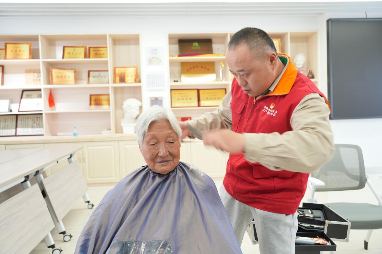 除了安全守护,社区还联合服务队推出多元化的便民服务集市,让老人们感受“家门口的温暖”。健康义诊区里,广盈集团物业党支部的医护人员细致为老人测量血压,结合数值给出“清淡饮食、按时吃降压药”等个性化建议,还手把手教老人用手机记录血压变化;义务理发区前,服务队的“托尼耿”成了“红人”——他一边熟练修剪头发,一边陪老人聊家常,剪完后还细心帮老人拂去碎发,清爽的发型让老人们脸上满是笑容。