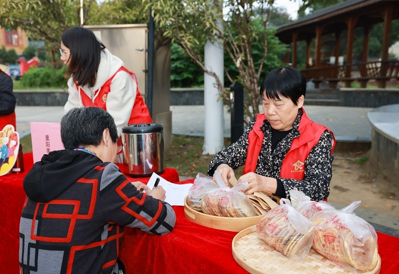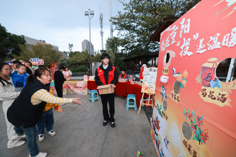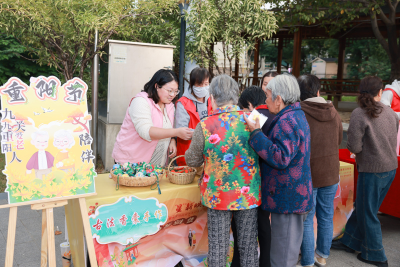 “乐龄暖金秋”板块聚焦老年人的实际需求,将贴心服务送到他们身边。便民服务区里,专业的急救知识演示吸引了不少居民驻足学习;膳食营养转盘前,大家纷纷动手转动,学习科学搭配的饮食知识;社情民意留言墙上,一张张留声贺卡和手写卡片,承载着居民对社区养老服务的期待。“时光回忆廊”的跨时空对话墙前,老少居民共同执笔,或寄语未来,或回望过去,在无声的交流中传递着生命经验与亲情温暖。而最具节日气息的“重阳趣雅集”区域,投沙包的欢笑声、品尝麦饼和菊花茶的赞叹声、制作茱萸香囊的探讨声此起彼伏,传统习俗与现代互动相融合,让老年朋友在参与中重拾童趣,沉浸于浓浓的节日氛围中。
