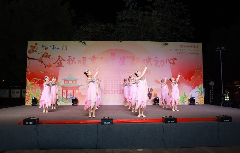 华灯初上,党建广场星光熠熠。来自钱桥街道15个社区的文艺团队联袂登台,将白天便民集市的融融暖意,延续为夜晚舞台上的精彩篇章。晚会在舞蹈《五星红旗》中拉开帷幕,以歌舞寄愿长者安康、社区和美。舞蹈《溜溜的山寨 溜溜的醉》洋溢着浓郁的民族风情;《幸福家园》舞出人们对美好生活的向往;《珊瑚颂》以经典旋律唤起一代人的集体记忆。独唱《狼图腾》雄浑苍劲,《我的祝福你听见了吗?》《同簪》则饱含深情,句句祝福温暖人心。太极表演《刀剑和鸣》刚柔并济,尽显长者风范与生命活力。从《月亮照山川+乘风破浪》到《阿瓦人民唱新歌》,从《过河》到《采茶情歌》,一个个精心编排的节目如一幅幅生动的时代画卷,串联起家国情怀与幸福日常。