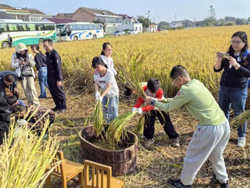 活动伊始,现场工作人员详细讲解水稻收割的流程、标准姿势与安全方法后,这些“小农夫”们在家长的陪伴下手持镰刀,满怀热情地步入稻田。他们左手稳稳攥住稻杆,右手用力挥镰。家长们在一旁耐心指导协助,还有家长还借此机会分享自己儿时的农耕记忆,让“珍惜粒粒辛苦”的理念伴着稻粒的脱落,深深扎根在孩子心中。随后的古法脱粒体验,也让孩子们对农耕文化有了更立体地认识。“小农夫”杨智勇兴奋的小脸通红,开心地说:“今天我体验了收割水稻,也明白了每一粒粮食都来之不易,以后我一定好好吃饭,不浪费粮食。”孩子们通过亲身体验,深切地领悟到了每一粒米的珍贵。