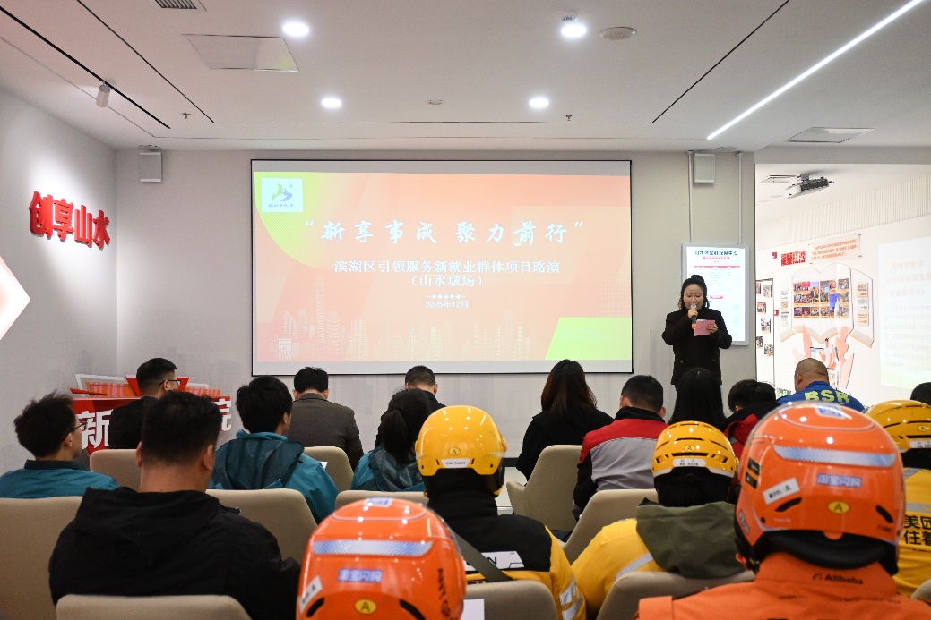 为持续提升新就业群体的归属感与获得感,推动服务资源精准触达,近日,“新享事成 聚力前行”滨湖区引领服务新就业群体项目路演(雪浪场)在山水城党群服务中心举办。山水城(雪浪街道)辖区相关单位、部门(条线)负责人以及新就业群体代表等30余人参加。