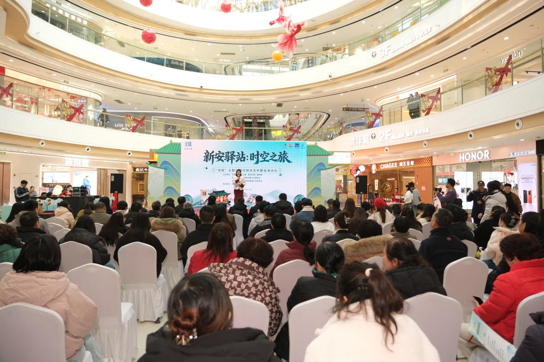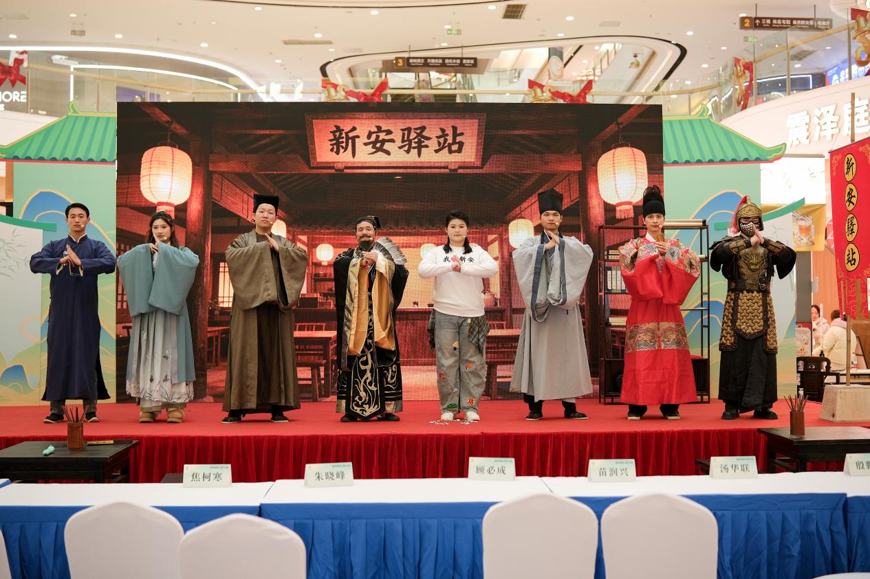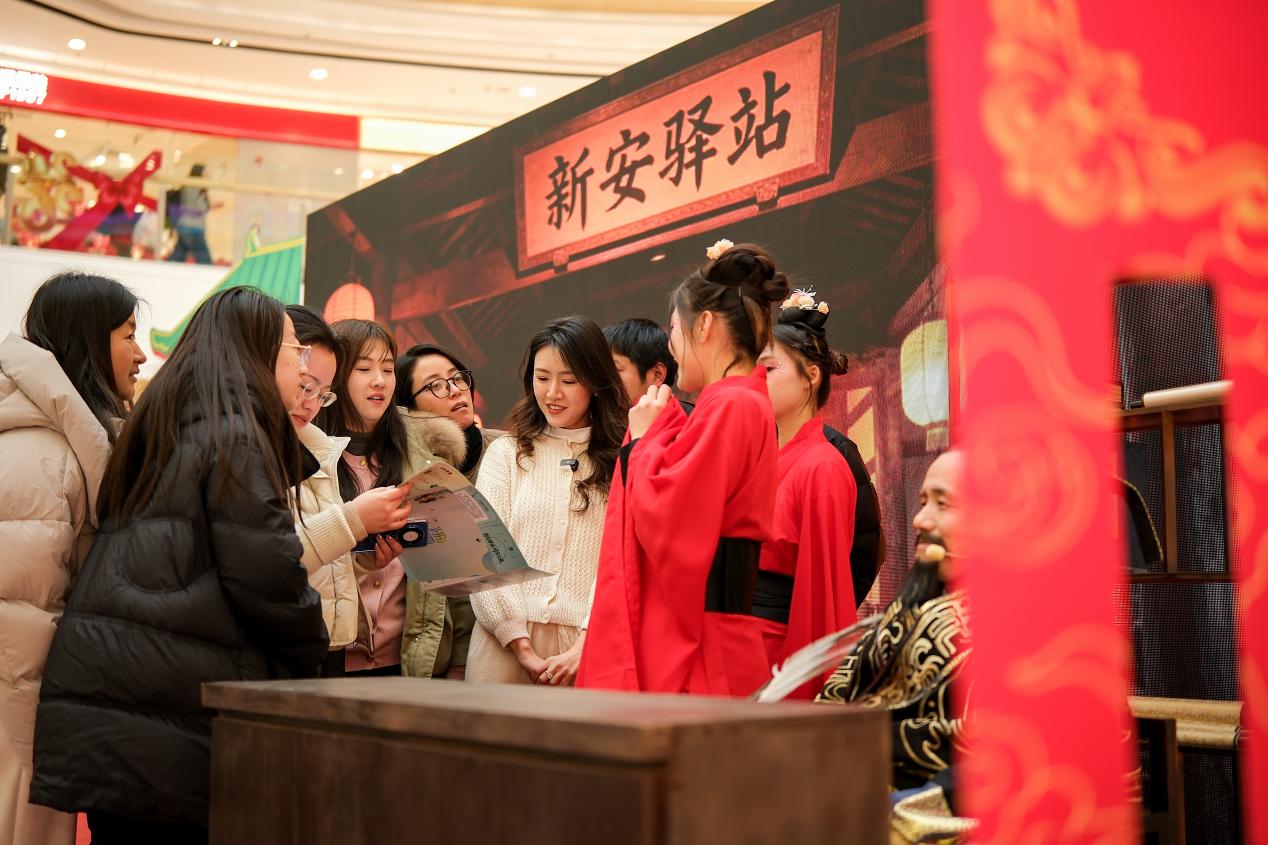 与传统文化活动不同,《新安驿站:时空之旅》的最大亮点在于“沉浸式”和“互动性”。项目以“新安驿站”为原创文化IP,将万达广场中庭这一商业空间改造为开放式“读城”体验场景,使原本以消费为主的公共空间,转化为可参与、可体验、可传播的文化空间。