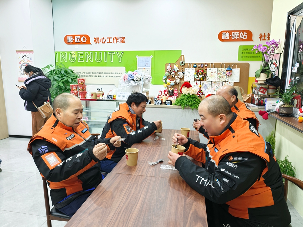 除了现场分享,社区工作人员与志愿者还组成“送暖小分队”,将打包好的腊八粥送到仍在奔波途中的快递员、环卫工人手中,为他们送上节日的问候与祝福。同时,不少居民也自发带来了自家的特色小吃、保暖物品,与新就业群体分享,你一言我一语的家常话里,拉近了邻里距离,凝聚了社区温情。