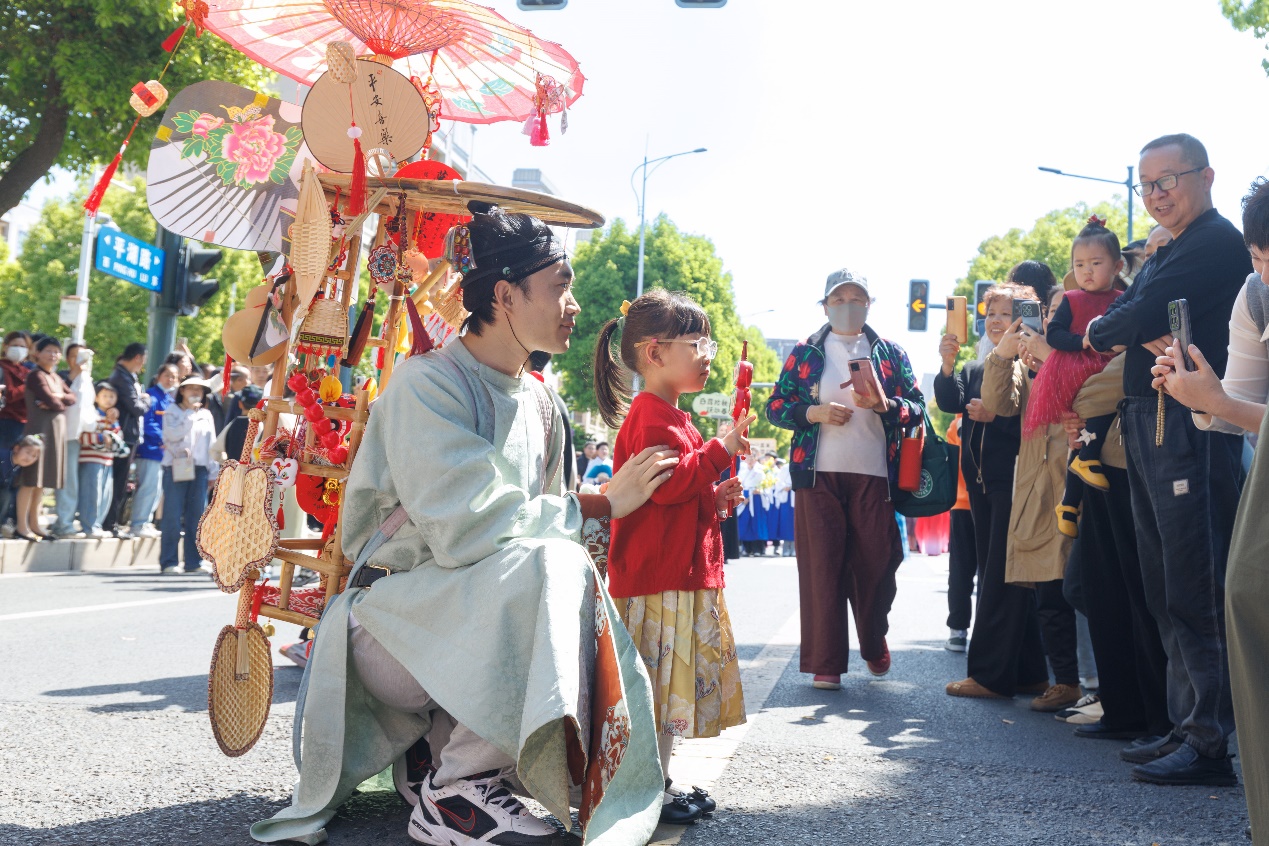 值得一提的是,今年的玉祁“三月三”凤阜民俗文化活动有了新玩法。活动设置唐平湖主会场、唐平湖大草坪、铜亭广场三大打卡点,市民游客完成三个点位打卡并与打卡点合影发朋友圈,即可领取消费券,消费券可用于非遗大观市集消费,可谓是诚意满满、干货满满。和家人一起完成打卡的市民张阿姨颇为开心:“今年的消费券很有意思,我们一家人先去唐平湖看完民俗巡游,再到铜亭广场这边兑换消费券,顺带买一些非遗美食,玩到了也吃到了。”刚用消费券买了网红小吃的李先生也是直呼过瘾:“从唐平湖到铜亭广场,就当是春游了,还有消费券,这一趟没白来。”玉祁街道文体部门负责人介绍:“考虑到活动区域周边停车不便,以及市民游客的不同需求,本次活动还特别开设接驳巴士路线,分两个时间段承包了市民游客去和回的行程,极大缓解了交通压力。”