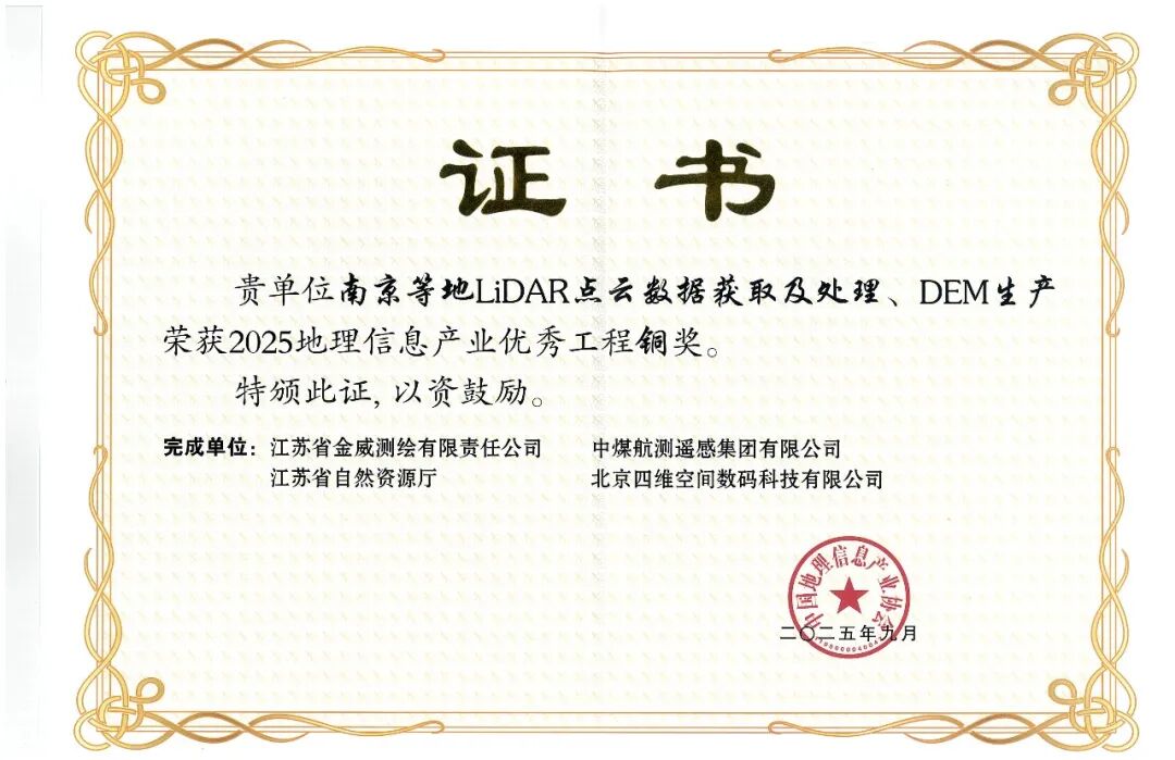 南京等地LiDAR点云数据获取及处理、DEM生产项目荣获2025地理信息产业优秀工程铜奖。该项目紧密围绕江苏实景三维建设与数字高程模型更新需求,采用先进的机载LiDAR技术,高效完成南京等重点区域点云数据的采集与处理工作,并实现了点云的自动化精细分类及高精度DEM、DSM产品的规模化生产。项目充分融合多源遥感数据,综合运用自动化处理流程与智能分类算法,有效克服了复杂地物噪声、植被遮挡等技术难点。目前,相关数据成果已在全省建筑物三维体块建模及城市级实景三维建设中发挥重要作用,推动了“数字江苏”与实景三维江苏的建设进程。