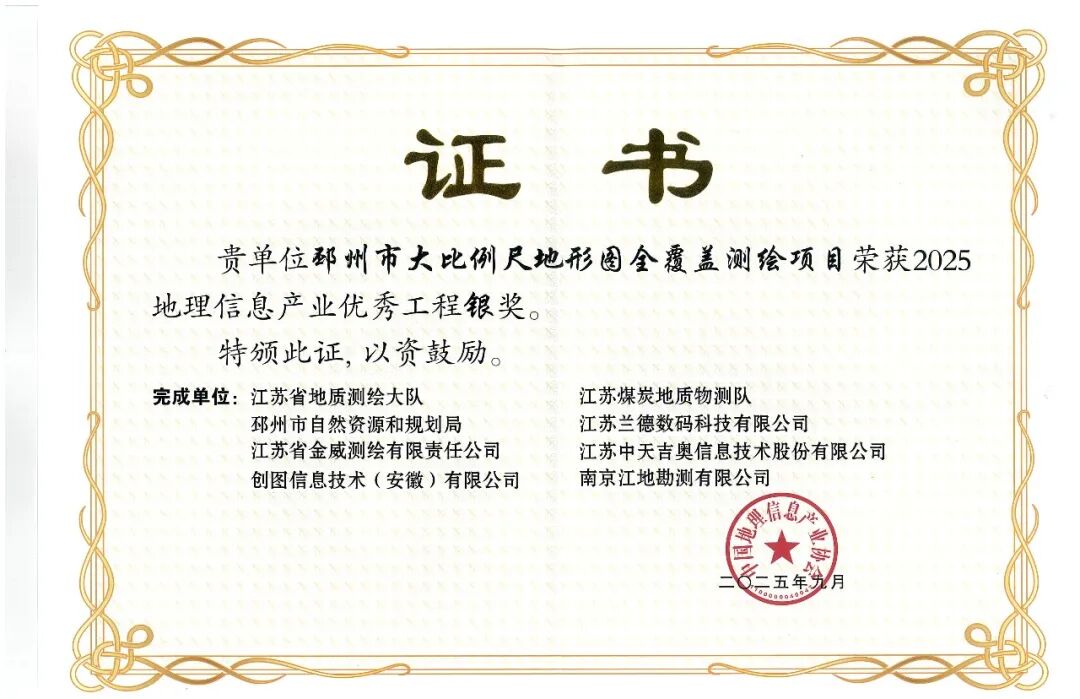 邳州市大比例尺地形图全覆盖测绘项目荣获2025地理信息产业优秀工程银奖。该项目完成了邳州市大比例尺地形图全覆盖测绘,同步建成城市实景三维模型与管理平台,系统提升了全市基础地理信息数据的精度与现势性,为“天地图·邳州”与智慧邳州时空大数据平台建设构筑了统一、权威的空间数据基底。通过优化技术路径、统筹整合现有数据资源,为邳州市高质量发展奠定了坚实的数据根基。