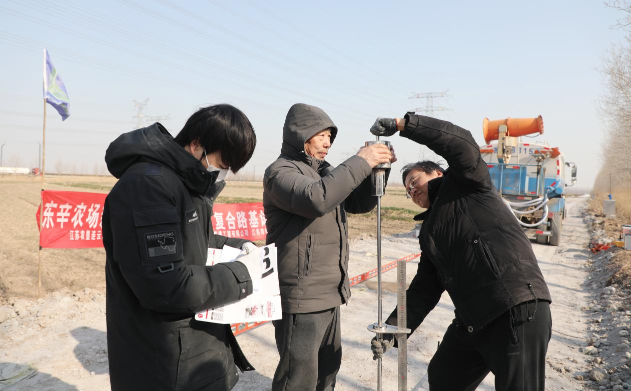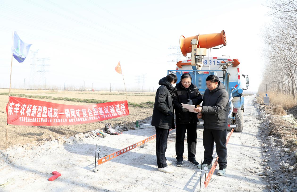 寒风凛冽,却挡不住科研攻坚的脚步。日前,江苏农垦连云港建筑工程有限公司与江苏海洋大学联合研发的“电厂脱硫灰复合材料在海淤地区路基工程中的应用技术”在东陬生产区103大队1500米试验路段正式落地,历经两天的连续奋战,多组核心数据采集工作顺利完成,标志着该项技术从实验室向工程实践迈出关键一步。