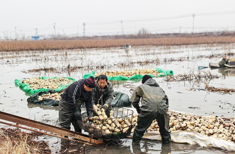 同样的丰收盛景,在首羡镇李堂煤矿塌陷区的藕塘里同步上演。冬日的藕塘水波潋滟,挖藕工人身着防水服,手持高压水枪在淤泥中细致探寻,一根根圆润饱满的莲藕带着湿润的泥土被缓缓拔出,清新的藕香扑面而来。很难想象,这片如今的“聚宝盆”,曾是一片因煤矿开采而满目疮痍的撂荒洼地。