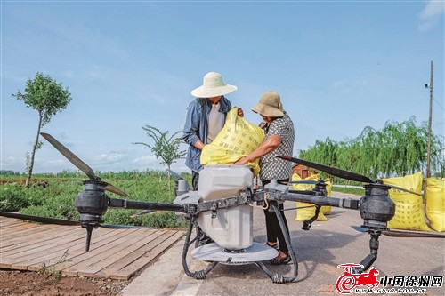 7月15日,沛县湖西农场高标准农田里,“飞手”操控无人机施肥。