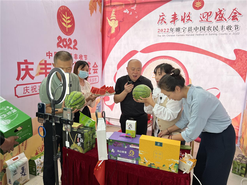 中国江苏网徐州9月19日讯(记者 张扬 通讯员 王金贺 陈士洲)为进一步拓宽销售渠道,促进特色产业发展,9月17日上午,徐州市睢宁县魏集镇党委副书记、镇长孟想变身“主播”代言魏集西瓜等特色产业代表团,走进睢宁县2022年“中国农民丰收节”开幕式现场,与农业龙头企业、农民专业合作社、家庭农场汇聚展区,现场展销带来的农特产品。