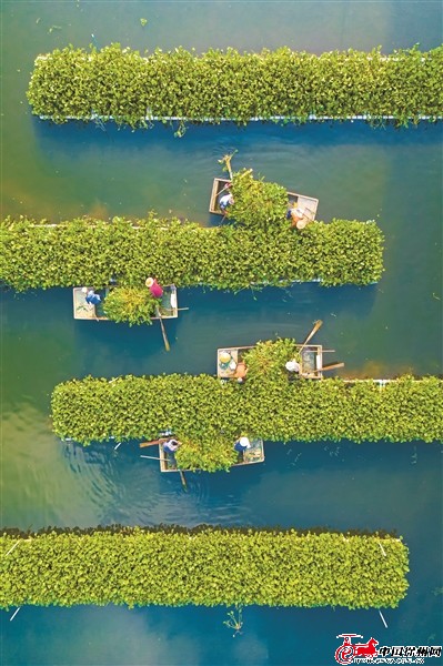 在柳新镇小沿河,工作人员调整净水草确保饮用水源安全。
