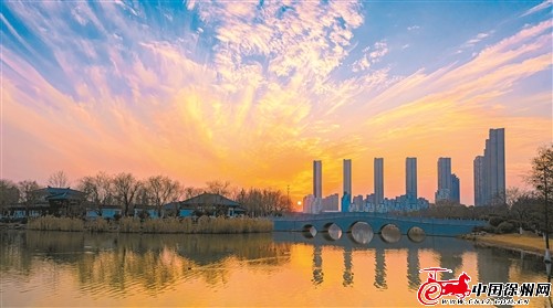 三八河倒映着绚烂晚霞。