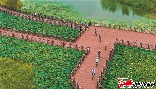 骑行车队行进在大沙河湿地公园。