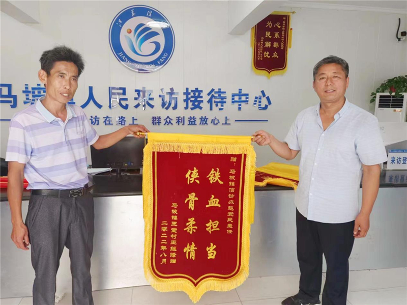 “谢谢你们给我找了一处合适的地方,让我有了新的养殖场地。”前不久,家住徐州市铜山区马坡镇王堂村的村民王某,带着印有“铁血担当 侠骨柔情”的锦旗送到镇信访办表达谢意。去年,在开展支流两岸清理工作中,村民王某是多家养殖户中的一户,后被依法拆除后,面临养殖难问题,信访干部帮助村民到相关部门协调,村干部努力寻找符合养殖条件的地块,网格员耐心做其思想工作,最后在镇、村、组三级“红色代办员”的共同协调努力下,找到了一处适合其养殖的场地,彻底解决了村民养殖难的问题。