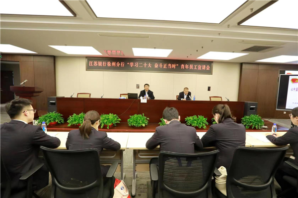 中国江苏网11月16日徐州讯 为深入学习贯彻党的二十大精神,引导广大青年员工自觉践行党的初心使命,以实际行动坚定不移跟党走,近日,江苏银行徐州分行团委举行“学习二十大 奋斗正当时”青年员工宣讲会,讲明白、讲生动、讲透彻,努力掀起宣讲党的二十大精神的热潮。各支行、各部室分行50余名青年员工代表参加会议。