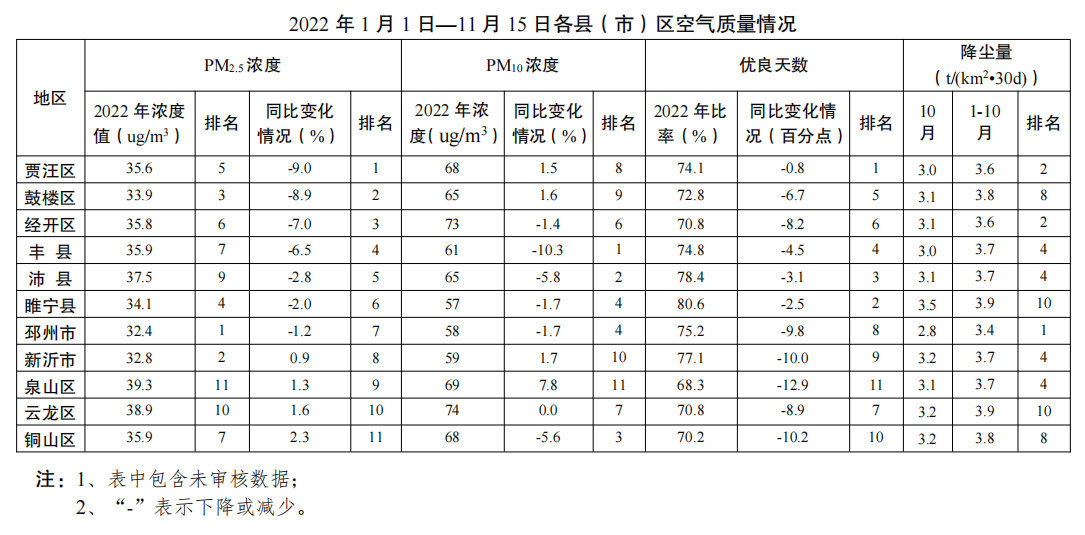 从各地情况看,截止到11月15日,徐州各县(市)区PM2.5浓度除铜山区、云龙区、泉山区、新沂市同比上升外,其余均同比下降;PM10浓度除泉山区、新沂市、鼓楼区、贾汪区同比上升,云龙区 同比持平外,其余均同比下降;从优良天数看均同比下降。