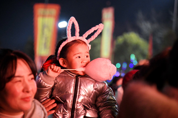 游客刘子尧和家人一起从徐州大黄山赶来看灯展,他说:“没想到花灯样式那么多,这里吃的玩的也多,很热闹!和家人一起来这里过元宵感觉挺开心!”