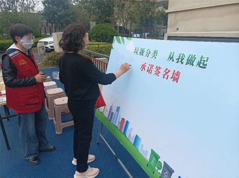 在党员干部的带领下,工作人员们逐一在垃圾分类签名承诺墙上写下了自己的名字,经过的居民纷纷停下脚步,踊跃地加入到签名承诺、学习垃圾分类知识的行列。