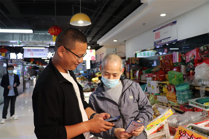“阿姨,咱们平时做生意,可要注意各类新型诈骗手段,尤其是各类扫码送礼品、高额利率投资推荐等,手机上出现的不明红包链接可不要轻易点开……”第三组志愿者们反诈宣传的声音在太行农贸市场回响。