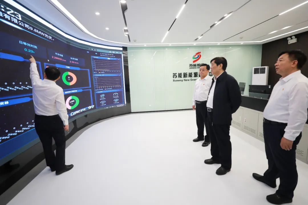 走进苏能新能源数字中心,冯兴振点开位于丰县的徐州冠华机械制造公司光伏项目现场视频,远程观看项目实景,并通过中心大屏了解项目实时运行情况。他强调,要坚持“内部全面落地、遍及江淮大地、走向全国各地”思路,大力发展新能源,运用数字信息技术推动产业提档升级,加快打造光伏、风电、储能、综合能源服务等新能源产业集群。