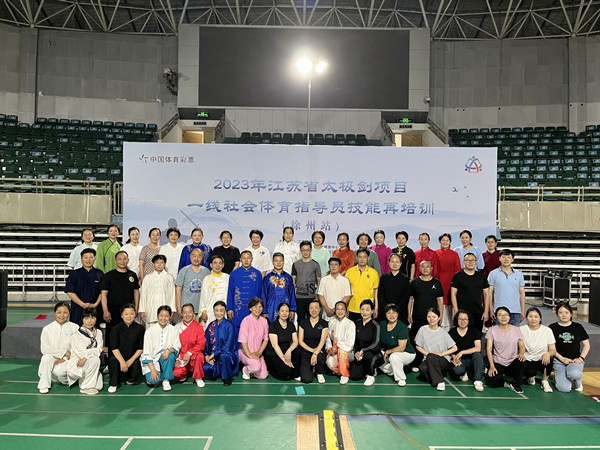 中国江苏网6月10日徐州讯 6月7日至10日,2023年江苏省太极剑项目一线社会体育指导员技能再培训活动在徐州市体育馆举行,来自南京、苏州、常州等地的50名学员参加本次培训。