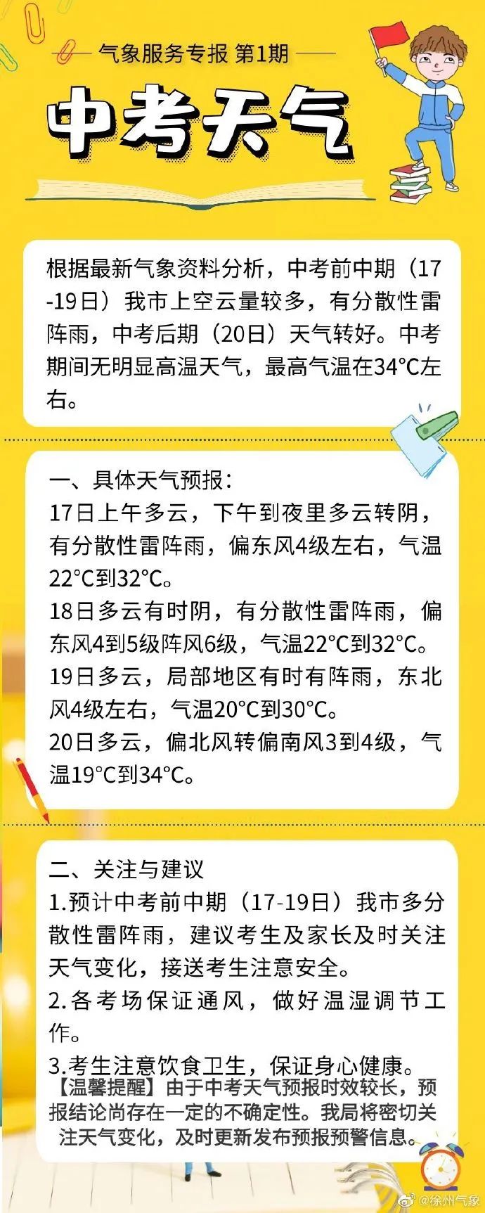 徐州市气象台2023年06月16日09时26分变更发布高温黄色预警信号:预计今天午后开始鼓楼区、云龙区、泉山区、经开区、港务区、铜山区、贾汪区的部分镇(街道)最高气温将达35℃左右,市应急局、气象局联合提醒加强防范。
