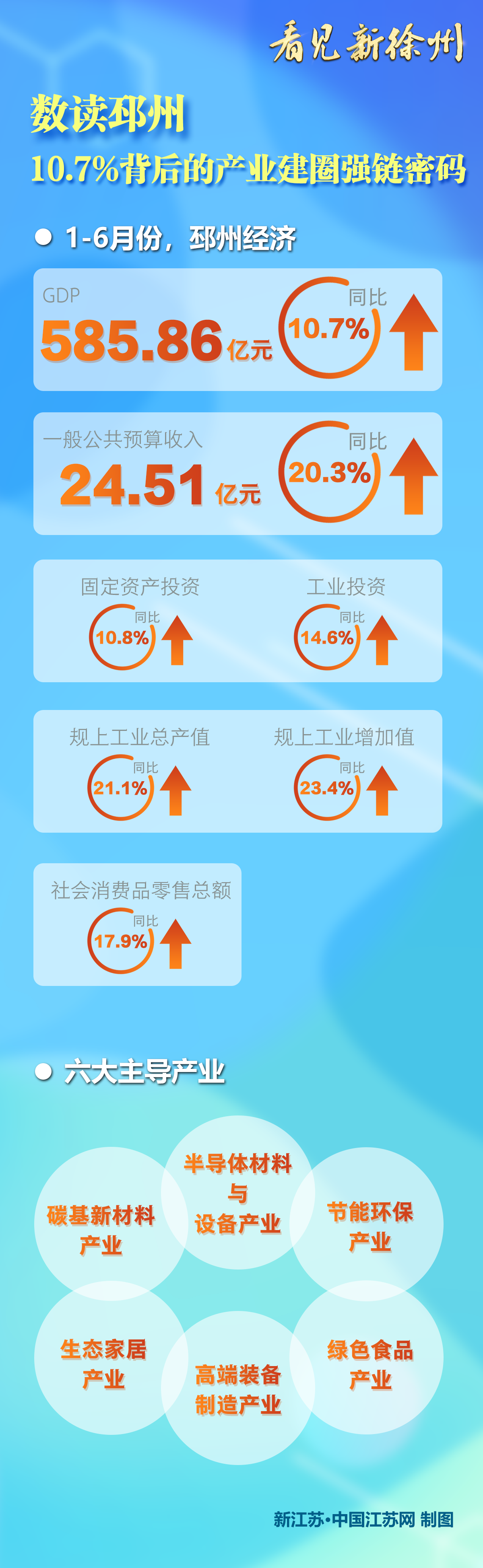 新江苏·中国江苏网讯 1-6月份,GDP实现585.86亿元、同比增长10.7%;一般公共预算收入24.51亿元、同比增长20.3%;固定资产投资同比增长10.8%,工业投资同比增长14.6%,规上工业总产值同比增长21.1%,规上工业增加值同比增长23.4%,社会消费品零售总额同比增长17.9%……2023年上半年,邳州市沿着争创高质量发展示范市的时间表、任务书和路线图序时推进,一连串数据,显示出经济大盘“稳”、动力“进”、质效“升”的发展态势。