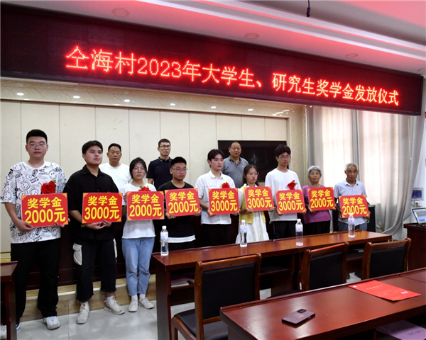 中国江苏网8月25日徐州讯 8月23日下午,睢宁县邱集镇仝海村举行2023年大学新生、研究生奖学金发放仪式,王飞翔、胡浩东、朱芳霖等9名大学本科新生和研究生领到了2000元至3000元的奖学金。这是仝海村第10年为本村大学新生和研究生颁发奖学金,10年共有72名仝海学子领取了村里颁发的奖学金。