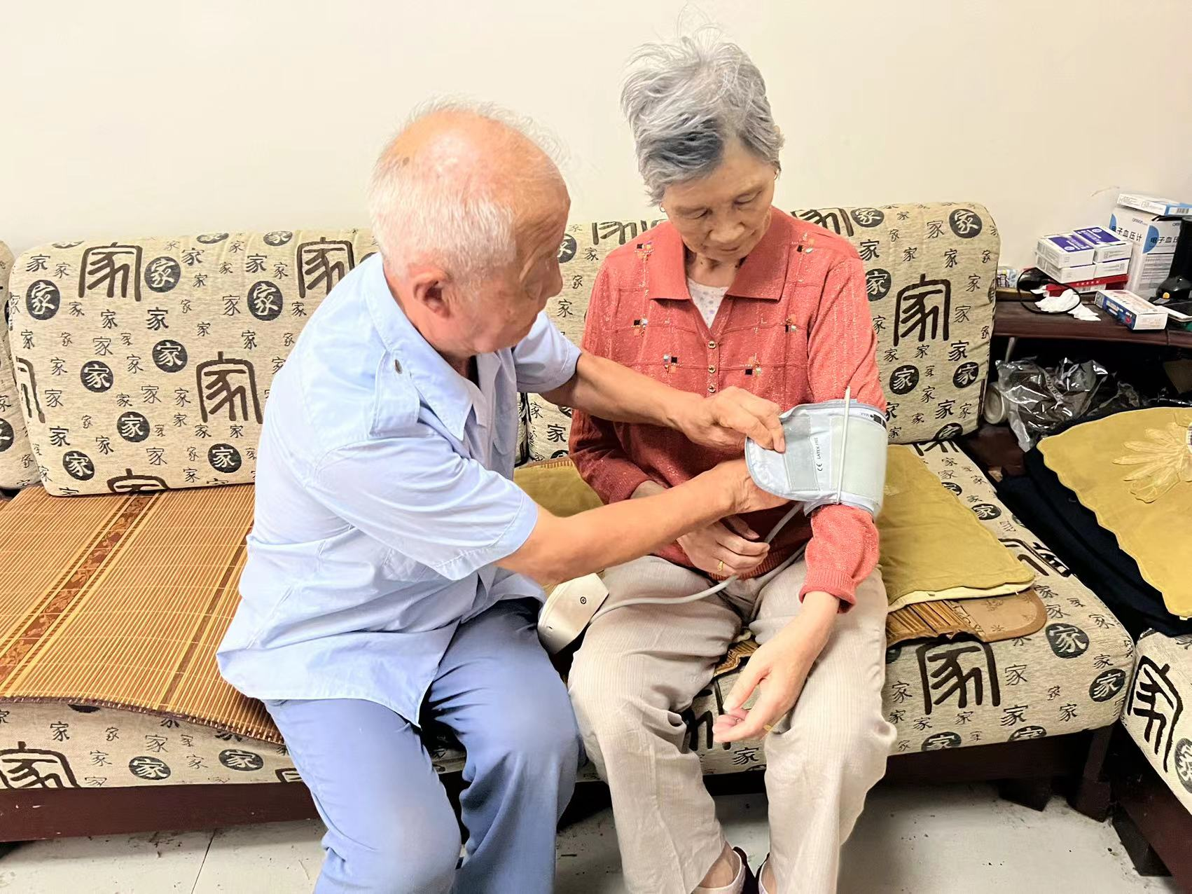 这边红色党课声声入耳,另一边,以老助老的一幕也正在上演,花年英今年85岁,因患有高血压等基础病,需要进行定期检查。今天,“银发团队”的志愿者一大早便来到她的家里,给她进行常规体检。“‘银发团队’的志愿者每周都会给我体检,给我量血压,对我很好,还给我打扫卫生,每天心情特别好,身体也倍儿棒。”花年英笑着说。
