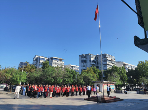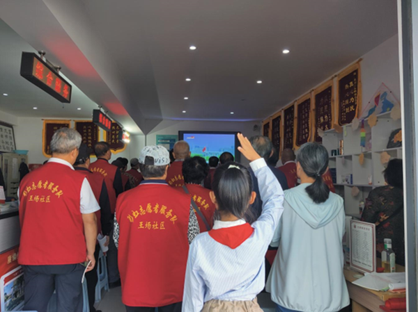 王场社区党委依托新时代文明实践站,组织辖区党员、网格员和志愿者开展升国旗、唱红色歌曲、廉洁主题签名活动,充分表达对祖国的热爱和崇高敬仰。随后,王场社区组织全体人员共同观看了徐州市国庆升旗仪式和庆典活动。