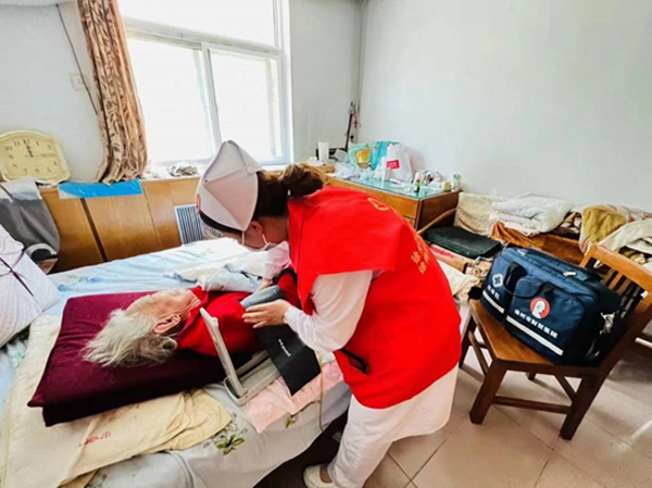 为了让行动不便的老人也能享受到温馨的义诊服务,医护人员跟随社区志愿者纷纷来到辖区内孤寡老人、独居老人家中,为他们测量血压、血糖,并耐心详细地提供健康指导等服务。