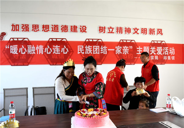 中国江苏网10月28日徐州讯 “五十六个星座,五十六支花,五十六族兄弟姐妹是一家……”10月27日上午,欢快的《爱我中华》歌声从睢宁县邱集镇小苏村新时代文明实践站飘出,由睢宁县民族宗教局和邱集镇统战办公室、镇新时代文明实践所共同筹办的“民族团结一家亲”集体生日会在小苏村举行,5名少数民族居民和部分汉族群众共同参加了这场特别的生日会。