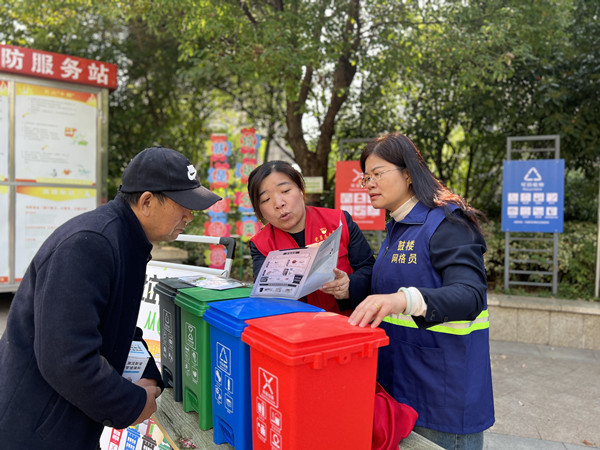 “大爷,咱们平时的剩菜剩饭属于厨余垃圾,得扔在绿色的垃圾桶里,这个彩页里面印了咱们生活中常见的垃圾分类方式,您按照上面写的分类就可以了。”近日,牌楼街道雅园社区组建包括党员干部、青年团员、社区工作人员、居民群众等在内的垃圾分类志愿服务队,常态化开展垃圾分类志愿服务活动,协助城管队员、垃圾分类引导员在收集点开放时段引导居民正确投放生活垃圾,并做好现场宣传。