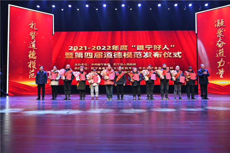 中国江苏网12月26日徐州讯(记者 张扬 通讯员 谭晓立)12月25日下午,江苏睢宁县举办2021-2022年度“睢宁好人”暨第四届道德模范名单发布仪式,表彰在见义勇为、诚实守信、孝老爱亲、敬业奉献、助人为乐等方面做出杰出贡献的个人和家庭,感谢他们为身边人树立榜样,用心用情诠释睢宁文明新风尚。