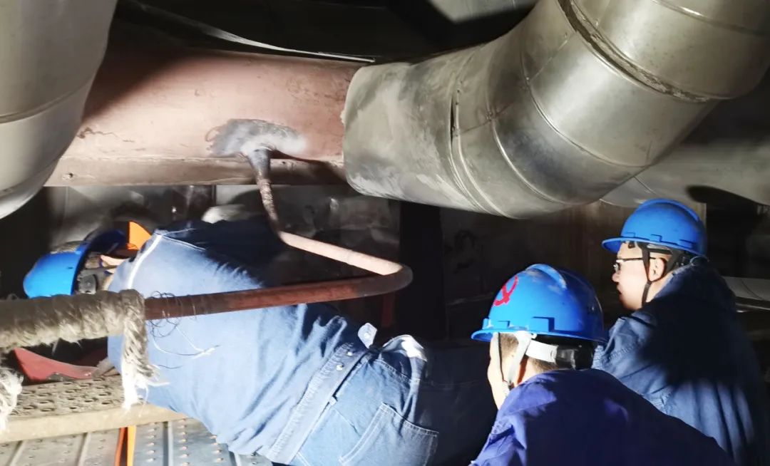当天值班人员刘伟带领班组成员,首先对保温层进行拆除,找出漏点,最终确定为#2机组水冷壁与下集箱连接处接口泄漏,因漏点的环境空间狭小、周围环境温度高,给抢修工作带来了巨大挑战。